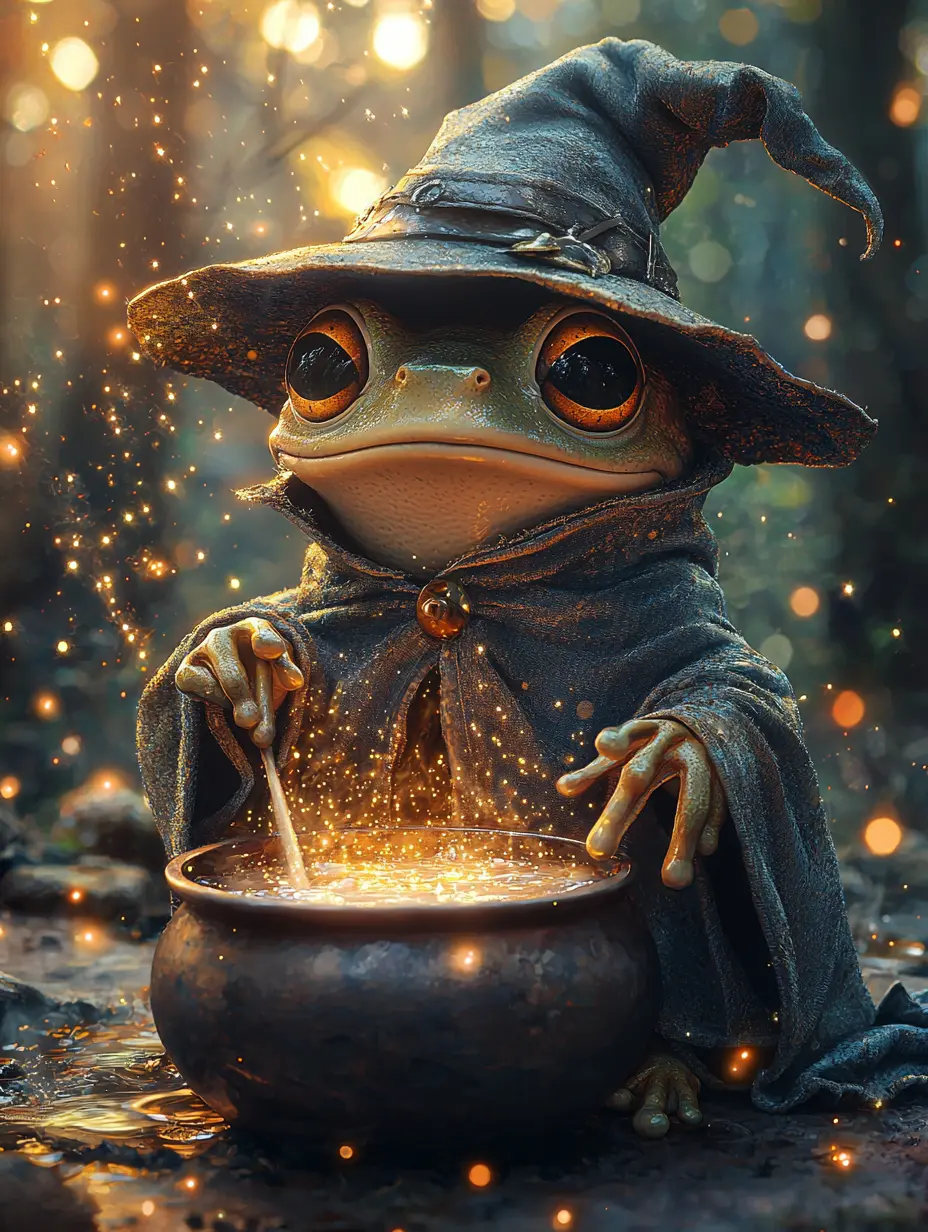 A tiny, wise frog in a wizard’s hat stirs a bubbling cauldron in an enchanted forest with floating sparkles and glowing mushrooms. This whimsical Disney-style artwork brings enchantment and magic to your space.