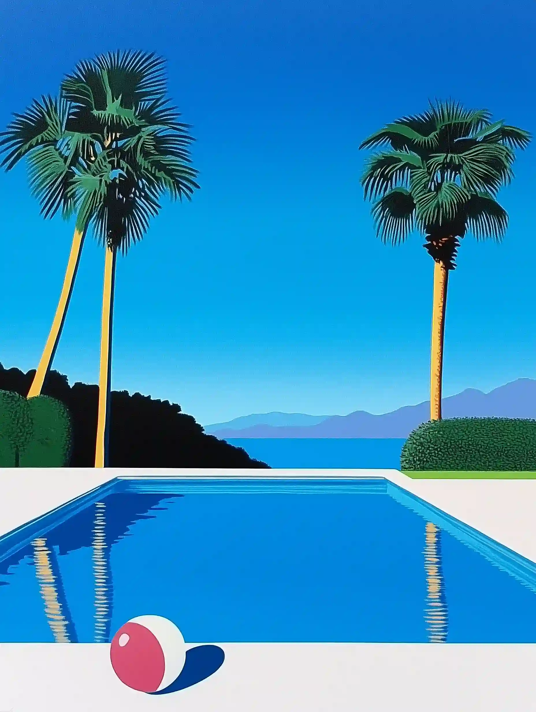 The Serene Poolside Canvas Art beautifully captures the essence of Hiroshi Nagai’s iconic summer style. Featuring a crystal-clear pool reflecting the bright blue sky and hazy mountains, this canvas radiates relaxation. A lone beach ball adds playful charm, while tall palm trees cast soft shadows, enhancing the tranquil tropical scene. This summer canvas art evokes a dreamy escape, perfect for creating a calming, minimalist atmosphere in your home or office. Ideal for lovers of tropical decor canvas art, this piece brings timeless, endless summer vibes to any space.